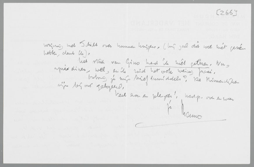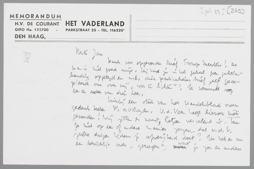 Dank voor opgezonden brief Tromp Meesters! De man is niet goed wijs. Hij had je in het geheel geen geheimhouding opgelegd en n.b. dien particulieren brief zelf gecopieerd om over mij ‘voor te lichten’! Ik verwacht nog een en ander van dien heer.