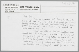 Hierbij een stuk van het Handelsblad over gedenkteeken P.v. Ostayen. V.d. Veen heeft hierover niets gezonden! Wij zitten er naast, hetgeen vervelend is. Kun je niet op een of andere manier zorgen, dat v.d. V. zulke dingen tijdens je afwezigheid doet? Ik heb er nu een berichtje over ‘gezogen’, want je zou er anders wrijving met Schilt over kunnen krijgen. (Hij zal dit wel niet gezien hebben, denk ik).