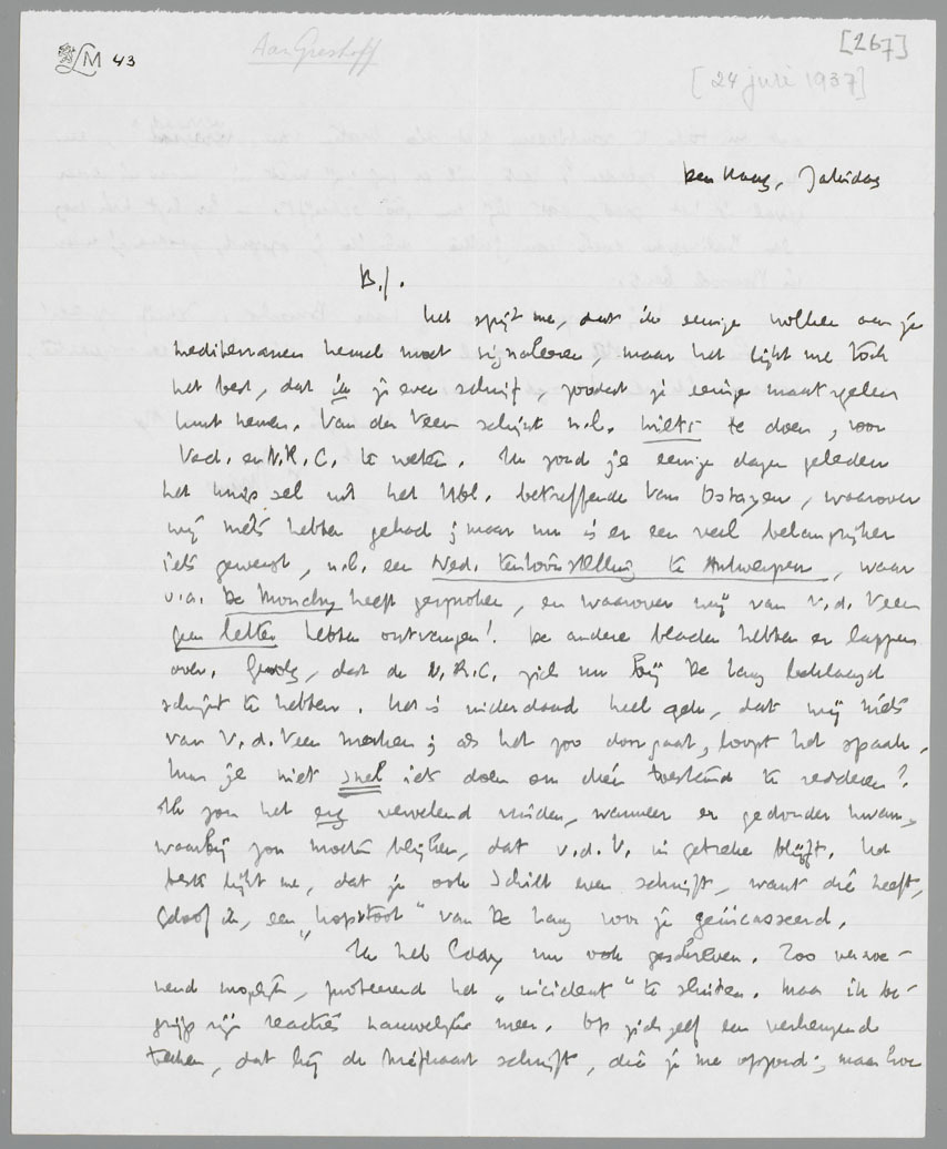 Het spijt me, dat ik eenige wolken aan je mediterranen hemel moet signaleeren, maar het lijkt me toch het best, dat ik je even schrijf, zoodat je eenige maatregelen kunt nemen. Van der Veen schijnt n.l. niets te doen, voor Vad. en N.R.C. te weten. Ik zond je eenige dagen geleden het knipsel uit het Hbl. betreffende Van Ostayen, waarover wij niets hebben gehad; maar nu is er een veel belangrijker iets geweest, n.l. een Ned. tentoonstelling te Antwerpen, waar o.a. De Monchy heeft gesproken, en waarover wij van v.d. Veen geen letter hebben ontvangen! De andere bladen hebben er lappen over. Gevolg, dat de N.R.C. zich nu bij De Lang beklaagd schijnt te hebben. Het is inderdaad heel gek, dat wij niets van V.d. Veen merken; als het zoo doorgaat, loopt het spaak. Kun je niet snel iets doen om dien toestand te redderen? Ik zou het erg vervelend vinden, wanneer er gedonder kwam, waarbij zou moeten blijken, dat v.d. V. in gebreke blijft. Het beste lijkt me, dat je ook Schilt even schrijft, want die heeft, geloof ik, een ‘kopstoot’ van De Lang voor je geïncasseerd.