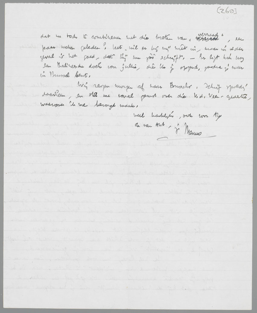 Ik heb Eddy nu ook geschreven. Zoo verzoenend mogelijk, probeerend het ‘incident’ te sluiten. Maar ik begrijp zijn reacties nauwelijks meer. Op zichzelf een verheugend teeken, dat hij de briefkaart schrijft, die je me opzond; maar hoe dat nu toch te combineeren met die kreten van ‘verraad’, een paar weken geleden? Het wil er bij mij niet in, maar in ieder geval is het goed, dat hij nu zóó schrijft. - Er ligt hier nog een Balineesche doek van jullie, dat ik je opzend, zoodra je weer in Brussel bent.