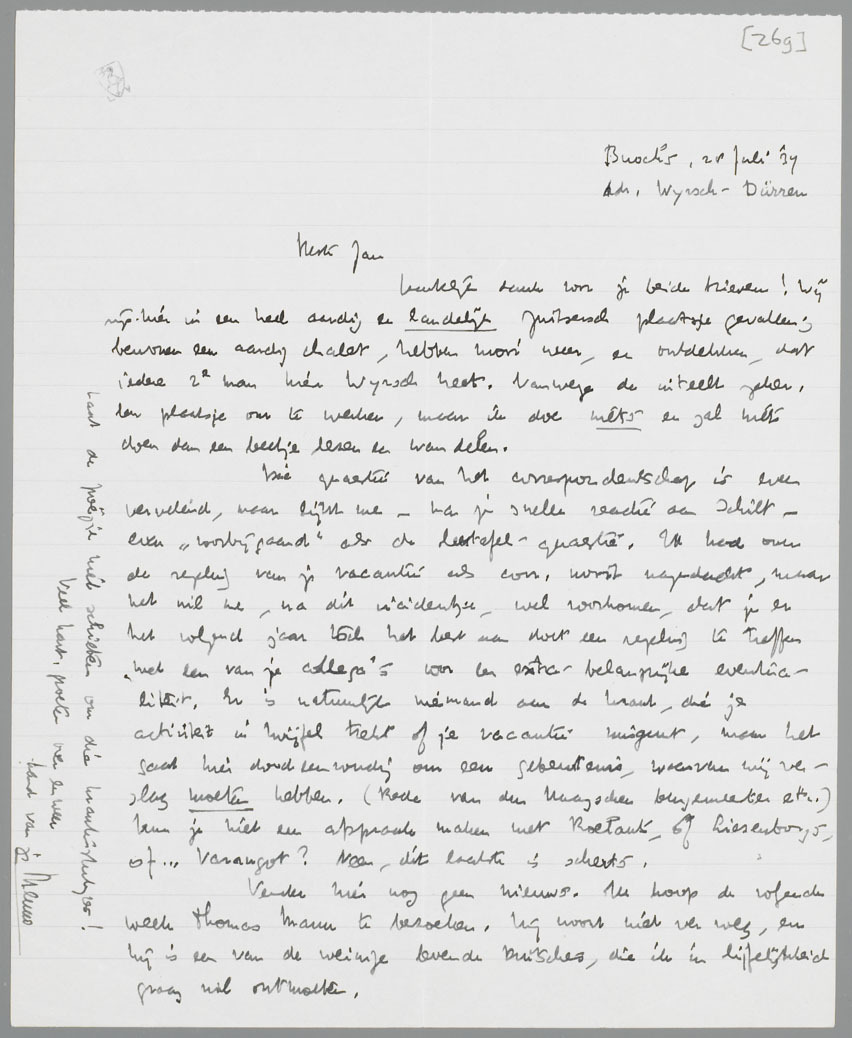 Hartelijk dank voor je beide brieven! Wij zijn hier in een heel aardig en landelijk Zwitsersch plaatsje gevallen; bewonen een aardig chalet, hebben mooi weer, en ontdekken, dat ieder 2e man hier Wyrsch heet. Vanwege de inteelt zeker. Een plaatsje om te werken, maar ik doe niets en zal niets doen dan een beetje lezen en wandelen.