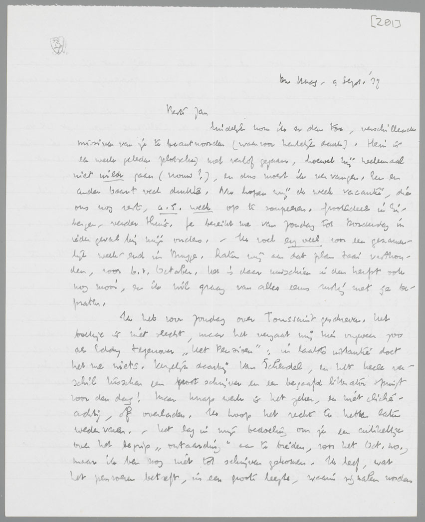 Eindelijk kom ik er dan toe, verschillende missiven van je te beantwoorden (waarvoor hartelijk dank). Hein is een week geleden plotseling met verlof gegaan, hoewel hij heelemaal niet wilde gaan (vrouw?), en dus moest ik vervangen. Een en ander baart veel drukte. Nu hopen wij de week vacantie, die ons nog rest, a.s. week op te soupeeren. Grootendeels in Eibergen, verder thuis. Je bereikt me van Zondag tot Donderdag in ieder geval bij mijn ouders. - Ik voel erg veel voor een gezamenlijk week-end in Brugge. Laten wij aan dat plan taai vasthouden, voor b.v. October. Het is daar misschien in den herfst ook nog mooi, en ik wil graag van alles eens rustig met je bepraten.