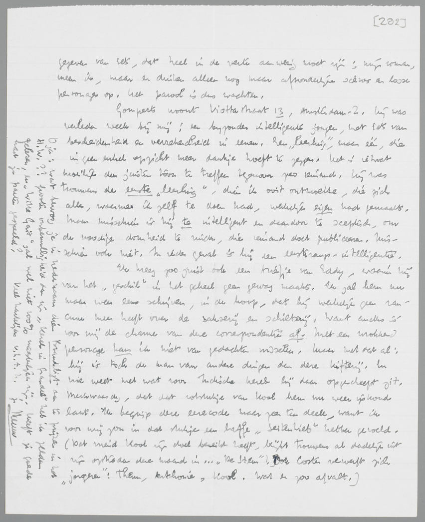 Gomperts woont Viottastraat 13, Amsterdam-Z. Hij was verleden week bij mij; een bijzonder intelligente jongen, met iets van bescheidenheid en verzekerdheid in eenen. Een ‘leerling’, maar één, die in geen enkel opzicht meer dankje hoeft te zeggen. Het is ietwat moeilijk den juisten toon te treffen tegenover zoo iemand. Hij was trouwens de eerste ‘leerling’, dien ik ooit ontmoette, die zich alles, waarmee ik zelf te doen had, werkelijk eigen had gemaakt. Maar misschien is hij te intelligent en daardoor te sceptisch, om de noodige domheid te vinden, die iemand doet publiceeren. Misschien ook niet. In ieder geval is hij een eersterangs-intelligentie.