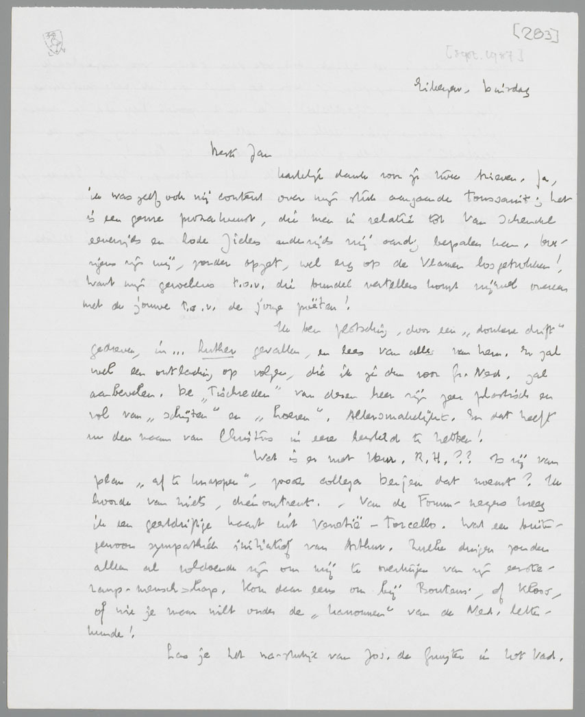Ik ben plotseling, door een ‘donkere drift’ gedreven, in... Luther gevallen, en lees van alles van hem. Er zal wel een ontlading op volgen, die ik je dan voor Gr. Ned. zal aanbevelen. De ‘Tischreden’ van dezen heer zijn zeer plastisch en vol van ‘schijten’ en ‘hoeren’. Allersmakelijkst. En dat heeft nu den naam van Christus in eere hersteld te hebben!