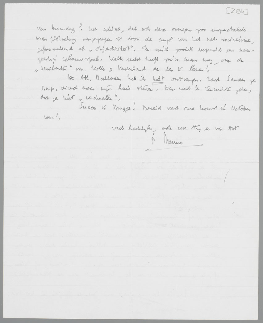 Las je het na-stukje van Jos. de Gruyter in Het Vad. van Maandag? Het schijnt, dat ook deze overigens zoo respectabele man zoo plotseling aangegrepen is door de angst voor het nat. socialisme, geformuleerd als ‘objectiviteit’. Ik vind zooiets bepaald een naargeestig schouwspel. Welk recht heeft zoo'n man nog, om de ‘scribenten’ van Volk & Vaderland de les te lezen!