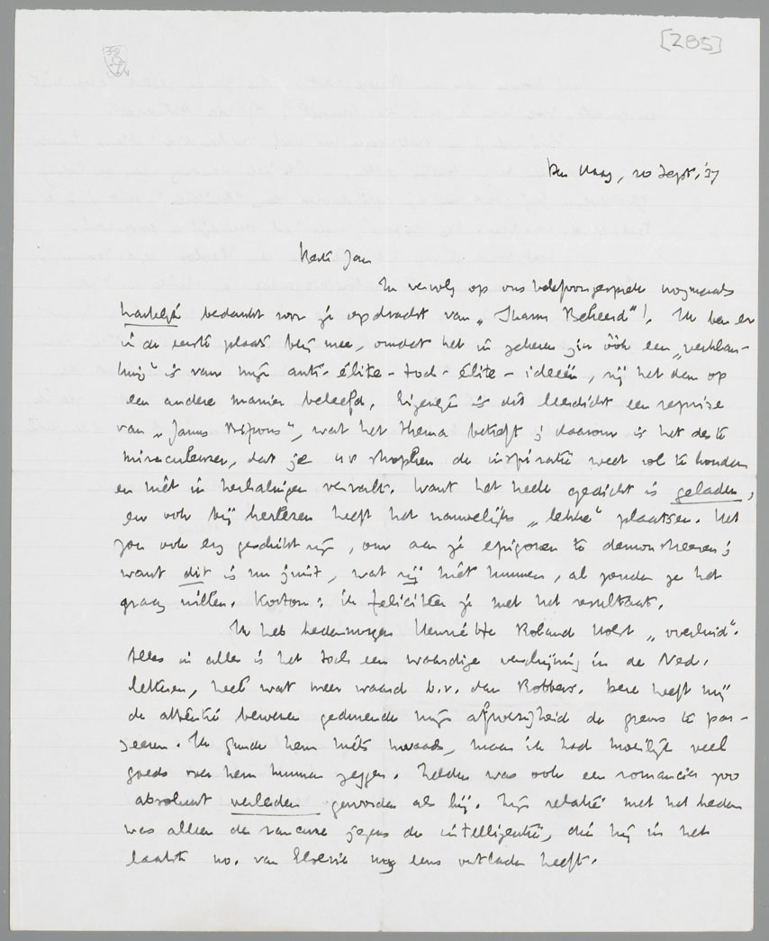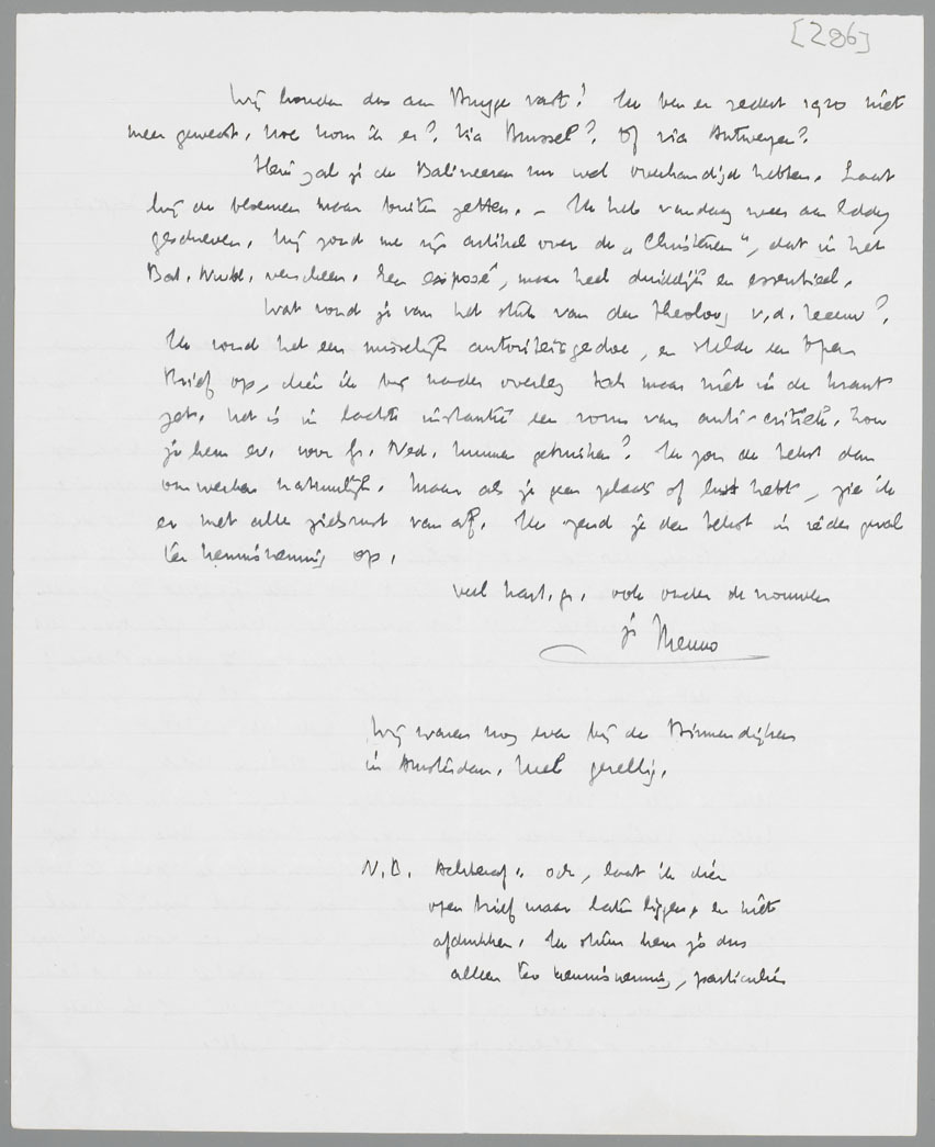 Ik heb hedenmorgen Henriette Roland Holst ‘overluid’. Alles in alles is het toch een waardige verschijning in de Ned. letteren, heel wat meer waard b.v. dan Robbers. Deze heeft mij de attentie bewezen gedurende mijn afwezigheid de grens te passeeren. Ik gunde hem niets kwaads, maar ik had moeilijk veel goeds over hem kunnen zeggen. Zelden was ook een romancier zoo absoluut verleden geworden als hij. Zijn relatie met het heden was alleen de rancune jegens de intelligentie, die hij in het laatste no. van Elsevier nog eens ontladen heeft.