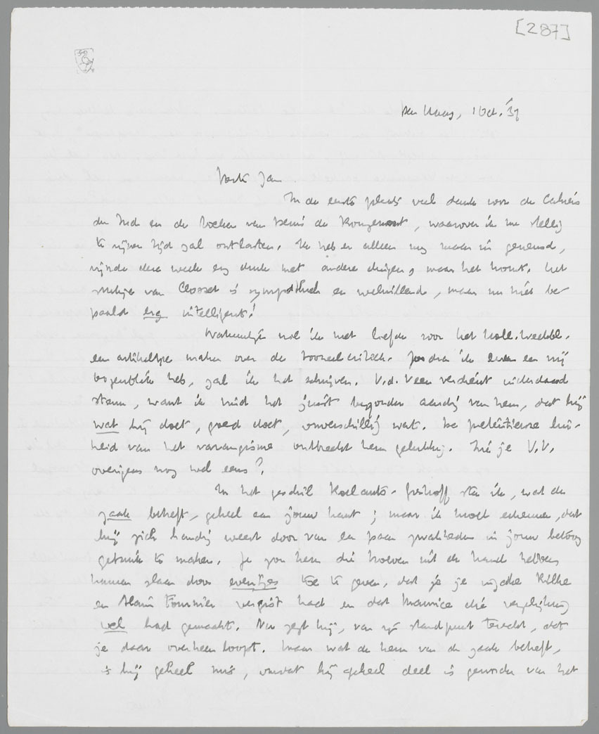 Gisteren ben ik aan ‘Het Vijfde Zegel’ begonnen. Wat een imponeerend formaat! Ik ben nog niet ver, en dus kan ik nog geen oordeel geven. Je uitroep: ‘wie kan dat in Nederland’ accepteer ik al op grond van het gelezene, zou ik trouwens vooraf al geaccepteerd hebben; maar ik voel iets tegenstribbelends in dit boek, iets te uitvoerigs en geleerds en scholastisch, dat ik op de eerste 50 pagina's nog niet heb overwonnen. Het Voorspel is heel goed, maar dan komt een stuk, dat mij te traag en uitvoerig is. Enfin, ik ben toch wel geboeid, maar niet op de manier van ‘Meneer Visser’.