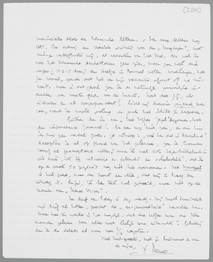 In het geschil Roelants - Greshoff sta ik, wat de zaak betreft, geheel aan jouw kant; maar ik moet erkennen, dat hij zich handig weert door van een paar zwakheden in jouw betoog gebruik te maken. Je zou hem die troeven uit de hand hebben kunnen slaan door eventjes toe te geven, dat je je inzake Rilke en Alain Fournier vergist had en dat Maurice die vergelijking wel had gemaakt. Nu zegt hij, van zijn standpunt terecht, dat je daar overheen loopt. Maar wat de kern van de zaak betreft, is hij geheel mis, omdat hij geheel deel is geworden van het provinciale blok der Vlaamsche letteren. - Van deze letteren nog iets. Ik ontving een speciale invitatie voor de ‘Hoogdagen’, met reis- en verblijfkosten vrij, als redacteur van Het Vad. Nu voel ik voor het Vlaamsche banketteeren geen zier, maar zou wel drie dagen (13 t/m 15 Nov.) een beetje in Brussel willen rondhangen, met jou vooral, zonder dat het van mijn vacantie afgaat of me ruïneert. Maar in dat geval zou ik er natuurlijk persoonlijke indrukken over moeten geven in de krant. Wat doe jij, als individu en als correspondent? Licht mij hierover omgaand even voor, want ik wacht zoolang de zaak met Schilt te bespreken.