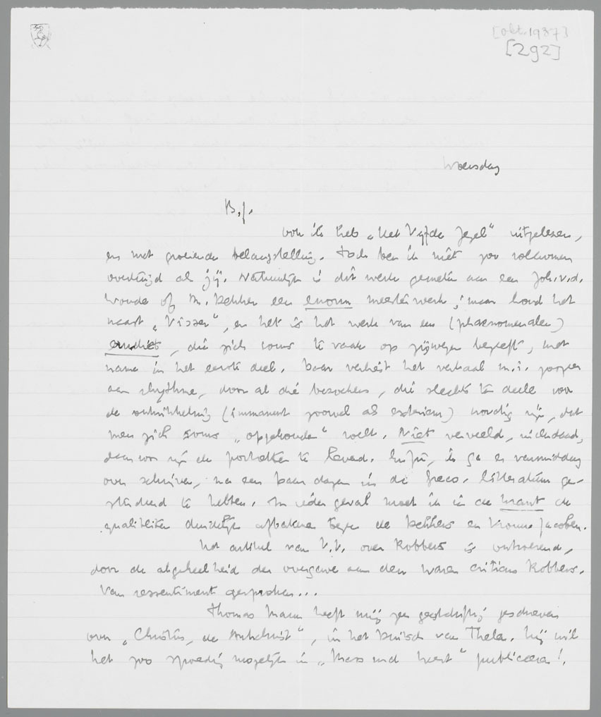Ook ik heb ‘Het Vijfde Zegel’ uitgelezen, en met groeiende belangstelling. Toch ben ik niet zoo volkomen overtuigd als jij. Natuurlijk is dit werk gemeten aan een Joh. v.d. Woude of M. Dekker een enorm meesterwerk; maar houd het naast ‘Visser’, en het is het werk van een (phaenomenalen) erudiet, die zich soms te vaak op zijwegen begeeft, met name in het eerste deel. Daar verliest het verhaal m.i. zoozeer aan rhythme, door al die bezoekers, die slechts ten deele voor de ontwikkeling (immanent zoowel als exterieur) noodig zijn, dat men zich soms ‘opgehouden’ voelt. Niet verdeeld, inderdaad, daarvoor zijn de portretten te levend. Enfin, ik ga er vanmiddag over schrijven, na een paar dagen in de Greco - litteratuur gestudeerd te hebben. In ieder geval moet ik in de krant de qualiteiten duidelijk afbakenen tegen de Dekkers en Vrouwe Jacoben.