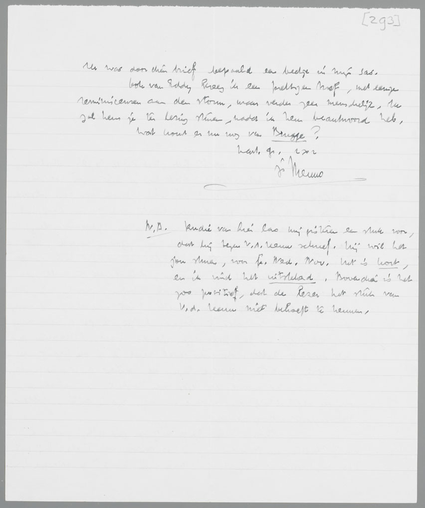 N.B. Rudie van Lier las mij gisteren een stuk voor, dat hij tegen V.d. Leeuw schreef. Hij wil het jou sturen, voor Gr. Ned. Nov. Het is kort, en ik vind het uitstekend. Bovendien is het zoo positief, dat de lezer het stuk van V.d. Leeuw niet behoeft te kennen.