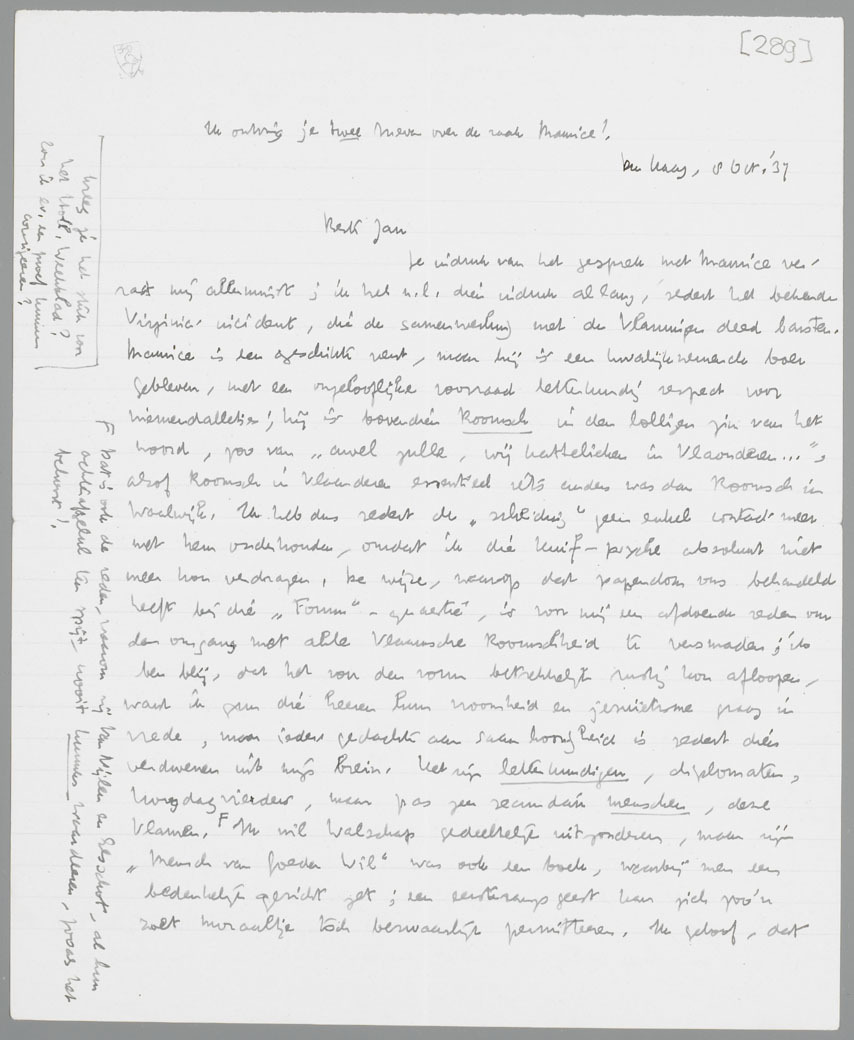 Je indruk van het gesprek met Maurice verrast mij allerminst; ik heb n.l. dien indruk al lang, sedert het bekende Virginia-incident, die de samenwerking met de Vlamingen deed barsten. Maurice is een geschikte vent, maar hij is een kwalijknemende boer gebleven, met een ongelooflijke voorraad letterkundig respect voor niemendalletjes; hij is bovendien Roomsch in den lolligen zin van het woord, zoo van ‘awel zulle, wij kattelieken in Vlaanderen...’, alsof Roomsch in Vlaanderen essentieel iets anders was dan Roomsch in Waalwijk. Ik heb dus sedert de ‘scheiding’ geen enkel contact meer met hem onderhouden, omdat ik die kuif-psyche absoluut niet meer kon verdragen. De wijze, waarop dat papendom ons behandeld heeft bij die ‘Forum’ - quaestie, is voor mij een afdoende reden om den omgang met alle Vlaamsche Roomschheid te versmaden; ik ben blij, dat het voor den vorm betrekkelijk rustig kon afloopen, want ik gun die heeren hun vroomheid en jezuïetisme graag in vrede, maar iedere gedachte aan saamhoorigheid is sedert dien verdwenen uit mijn brein. Het zijn letterkundigen, diplomaten, Hoogdagvierders, maar pas zeer secundair menschen, deze Vlamen. Dat is ook de reden, waarom zij Van Nijlen en Elsschot, al hun achterafgelul ten spijt, nooit kunnen waardeeren, zooals het behoort!
