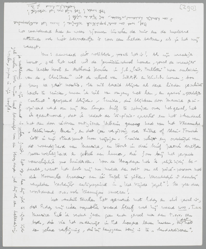 Dus: aanvaard dit rotsblok, zooals het is! Als zijn wraakje komt, zal het wel uit de Jezuïetenschool komen, zooals de wraakjes van Halbo Kool en Anthonie Donker in j.l. ‘Crit. Bulletin’ naar aanleiding van de ‘Christenen’ uit de school van S.D.A.P. en V.C.S.B. komen; bon sang ne peut mentir. Ik wil bereid blijven al deze lieden geschikte kerels te vinden, maar ik wil van omgang met hen, en quasi ‘geestelijk contact’ gespeend blijven. - Truida, die blijkbaar door Maurice geinspireerd werd om mij een langen brief te schrijven over het geval, heb ik geantwoord, dat ik sedert de Virginia-quaestie en het schandaal met den door iedereen ontzienen Urbain genoeg had van het Vlaamsche ‘letterkundig leven’, en dat geen vergissing over Rilke of Alain Fournier iets in mijn standpunt kon wijzigen. Truida schijnt erg overtuigd van de waardigheid van Maurice, en toont in dien brief precies dezelfde zwaarwichtigheid en gebrek aan humor, die jou bij het gesprek waarschijnlijk zoo hinderden. Voor de Hoogdagen heb ik gelijktijdig bedankt, want het lust mij nu minder dan ooit om als privé-persoon met die Roomsche broeders aan één tafel te zitten. Verrukkelijk is daarbij vergeleken Vestdijks antipapisme in ‘Het Vijfde Zegel’! Ik zie daar voortdurend o.a. ook Vlamingen smoezen!