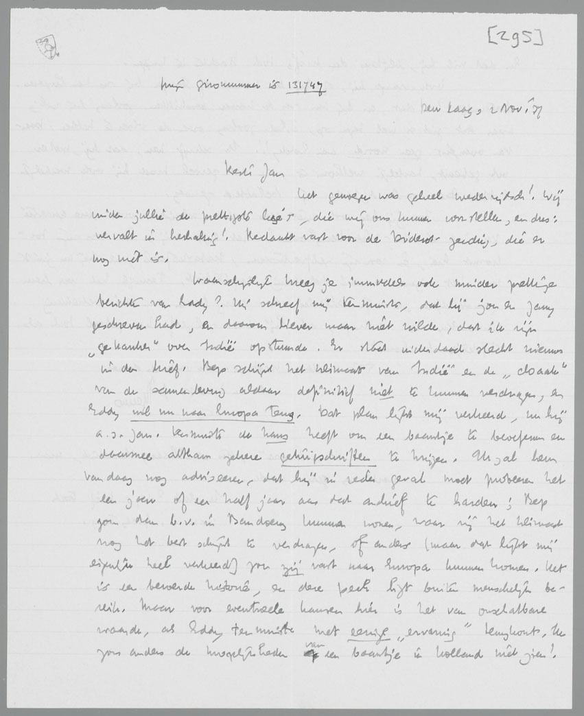 Waarschijnlijk kreeg je inmiddels ook minder prettige berichten van Eddy? Hij schreef mij tenminste, dat hij jou en Jany geschreven had, en daarom liever maar niet wilde, dat ik zijn ‘gekanker’ over Indië opstuurde. Er staat inderdaad slecht nieuws in den brief. Bep schijnt het klimaat van Indië en de ‘cloaak’ van de samenleving aldaar definitief niet te kunnen verdragen, en Eddy wil nu naar Europa terug. Dat plan lijkt mij verkeerd, nu hij a.s. Januari tenminste de kans heeft om een baantje te beoefenen en daarmee althans zekere getuigschriften te krijgen. Ik zal hem vandaag nog adviseeren, dat hij in ieder geval moet probeeren het een jaar of een half jaar aan dat archief te harden; Bep zou dan b.v. in Bandoeng kunnen wonen, waar zij het klimaat nog het best schijnt te verdragen, of anders (maar dat lijkt mij eigenlijk heel verkeerd) zou zij vast naar Europa kunnen komen. Het is een beroerde historie, en deze pech ligt buiten menschelijk bereik. Maar voor eventueele kansen hier is het van onschatbare waarde, als Eddy tenminste met eenige ‘ervaring’ terugkomt. Ik zou anders de mogelijkheden van een baantje in Holland niet zien! En dat wil hij, blijkens den brief, toch trachten te krijgen.