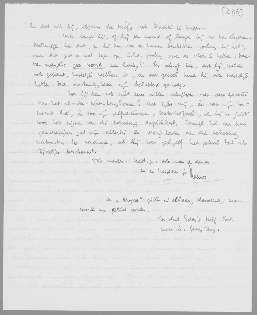 Ook vraagt hij, of hij een maand of langer bij ons kan logeeren. Natuurlijk kan dat, en hij kan over de kamer beschikken zoolang hij wil; maar Ant ziet er wel tegen op, Z.Ed. zoolang over de vloer te hebben. Daarvan overigens geen woord aan Eddy!! Ik schrijf hem, dat hij, wat er ook gebeurt, hartelijk welkom is, en dat gevoel moet hij ook werkelijk hebben. De omstandigheden zijn belabberd genoeg.
