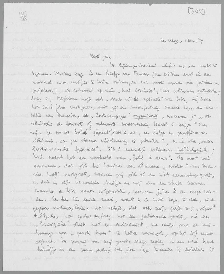 De lijdensgeschiedenis schijnt nu pas recht te beginnen. Vandaag krijg ik een briefje van Truida (na gisteren eerst al een woedend ander briefje te hebben ontvangen met groote woorden over fatsoen en onfatsoen), als antwoord op mijn ‘kort bescheid’, dat volkomen ontoerekenbaar is. Blijkbaar heeft zich, dank zij de agitatie van V.V., bij haar het idée fixe vastgezet, dat jij een samenzwering smeedt tegen de reputatie van Maurice, een ‘lastercampagne’ organiseert, waarvoor je ‘op slinksche [wijze] de bewuste of onbewuste medewerking tracht te krijgen’ van mij. Je wordt hier gequalificeerd als ‘een laffe en geraffineerde intrigant, om geen sterkere uitdrukking te gebruiken’, en ik sta ‘onder Greshoviaansche hypnose’. Dit is werkelijk volkomen pathologisch; Wim noemt het een voorbeeld van ‘folie à deux’. Ik moet wel aannemen, dat zich bij Truida een of andere ‘voorkeur’ voor Maurice heeft vastgezet, waarvan zij zich al dan niet rekenschap geeft, en dat in dit verwoede briefje aan mij dus een strijd tusschen Maurice en V.V. wordt uitgevochten, waarvan jij en ik de dupe worden. Ik ben ten einde raad, want er is niets tegen te doen, in de gegeven omstandigheden. Het schijnt, dat ook mij, gelijk mijn ‘afgod’ Nietzsche, het gedonderjaag met een jaloersche zuster, die een ‘Ersatzehe’ sluit met een antisemiet, na eenige jaren de huishouding voor ‘groote broer’ te hebben verzorgd, op het lijf wordt gejaagd. De poging om mij zonder eenige reden in een idée fixe betreffende een samenzwering van jou tegen Maurice te betrekken is n.b. zoo evident onzinnig, dat ik er niets anders dan dat achter kan zoeken.