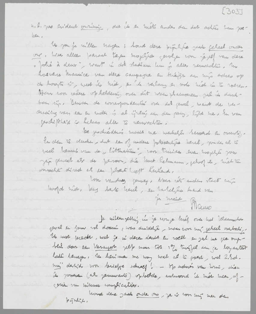 Ik zou je willen vragen: houd deze pijnlijke zaak geheel onder ons. Wees alleen paraat tegen mogelijke gevolgen voor jezelf van deze ‘folie à deux’, want in dit stadium kun je alles verwachten. In hoeverre Maurice van deze campagne en briefjes aan mijn adres op de hoogte is, weet ik niet, en ik verlang er ook niet in te roeren. Maar voor iedere opheldering over dit waanphaenomeen zal ik dankbaar zijn. Bewaar de correspondentie over dit geval, want de verdraaiing van een en ander is al ijverig aan de gang, lijkt me. En van geschiftheid is helaas alles te verwachten.