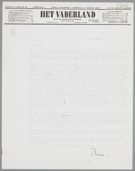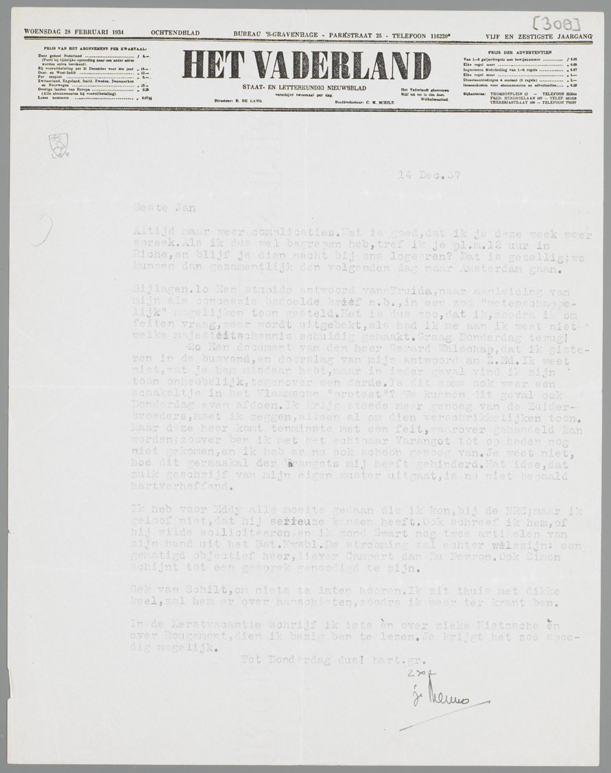 2. Een document van den heer Gerard Walschap, dat ik gisteren in de bus vond, en doorslag van mijn antwoord aan Z.Ed. Ik weet niet, wat je hem misdaan hebt, maar in ieder geval vind ik zijn toon onhebbelijk, tegenover een derde. Is dit soms ook weer een schakeltje in het Vlaamsche ‘protest’? We kunnen dit geval ook Donderdag even afdoen. Ik krijg steeds meer genoeg van de Zuiderbroeders, moet ik zeggen, alleen al om dien verschrikkelijken toon. Maar deze heer komt tenminste met een feit, waarover gehandeld kan worden; zoover ben ik met het echtpaar Varangot tot op heden nog niet gekomen, en ik heb er nu ook schoon genoeg van. Je weet niet, hoe dit geraaskal der Varangots mij heeft gehinderd. Het idee, dat zulk geschrijf van mijn eigen zuster uitgaat, is nu niet bepaald hartverheffend.