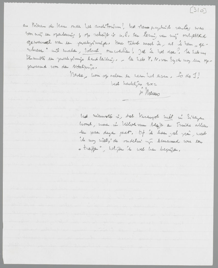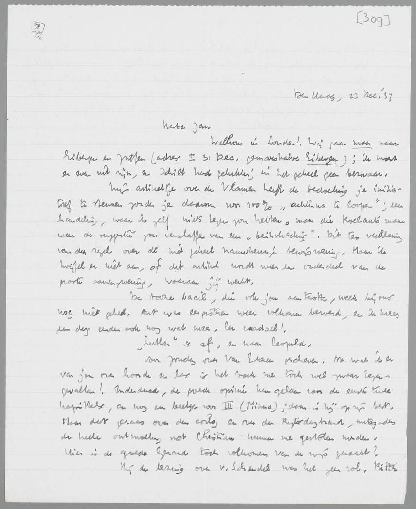 Bij de lezing over v. Schendel was het zeer vol. Ritter en Bierens de Haan onder het auditorium! Het stenographisch verslag was voor mij een openbaring; op schrift is n.l. een lezing van mij ontzettend gewauwel van een zwakzinnige. Deze tekst moet ik, als ik hem ‘geschreven’ wil maken, totaal omwerken! Zal ik het doen? Ik heb nu tenminste een zwakzinnige handleiding. - Ik heb P.N. van Eyck nog eens opgewarmd voor den Nobelprijs.