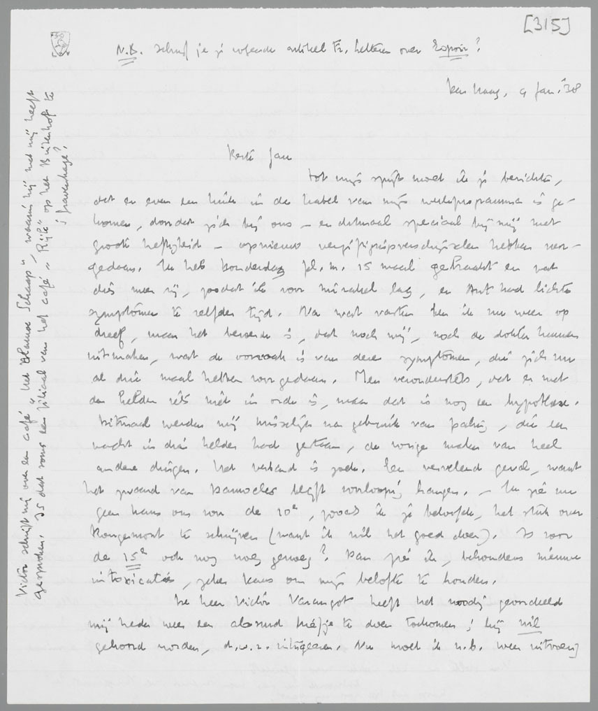 Tot mijn spijt moet ik je berichten, dat er even een kink in de kabel van mijn werkprogramma is gekomen, doordat zich bij ons - en ditmaal speciaal bij mij met groote heftigheid - opnieuw vergiftigingsverschijnselen hebben voorgedaan. Ik heb Donderdag pl. m. 15 maal gebraakt en wat dies meer zij, zoodat ik voor mirakel lag, en Ant had lichte symptomen te zelfder tijd. Na wat vasten ben ik nu weer op dreef, maar het beroerde is, dat noch wij, noch de dokter kunnen uitmaken, wat de oorzaak is van deze symptomen, die zich nu al drie maal hebben voorgedaan. Men veronderstelt, dat er met den kelder iets niet in orde is, maar dat is nog een hypothese. Ditmaal werden wij misselijk na gebruik van paling, die een nacht in dien kelder had gestaan, de vorige malen van heel andere dingen. Het verband is zoek. Een vervelend geval, want het zwaard van Damocles blijft voorloopig hangen. - Ik zie nu geen kans om voor de 10e, zooals ik je beloofde, het stuk over Rougemont te schrijven (want ik wil het goed doen). Is voor de 15e ook nog vroeg genoeg? Dan zie ik, behoudens nieuwe intoxicaties, zeker kans om mijn belofte te houden.