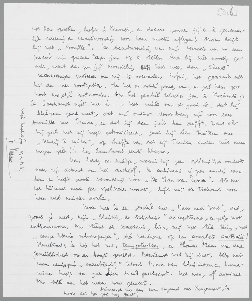 Verder heb ik een geschil met ‘Mass und Wert’, dat, zooals je weet, mijn ‘Christus, de Antichrist’ accepteerde, en zelfs met enthousiasme. Nu stuurt de secretaris, Lion, mij het stuk terug, met ‘eenige kleine schrappingen’, die neerkomen op een complete castratie! Resultaat: ik heb het ms. teruggetrokken, en Thomas Mann van dezen jezuïetenstreek op de hoogte gesteld. Benieuwd wat hij doet. Alles wat maar eenigszins ‘oneerbiedig’ klonk t.o.v. van Christendom en humanisme heeft de zak Lion er uitgeschrapt. Het was, of dominee van Holk aan het werk was geweest.
