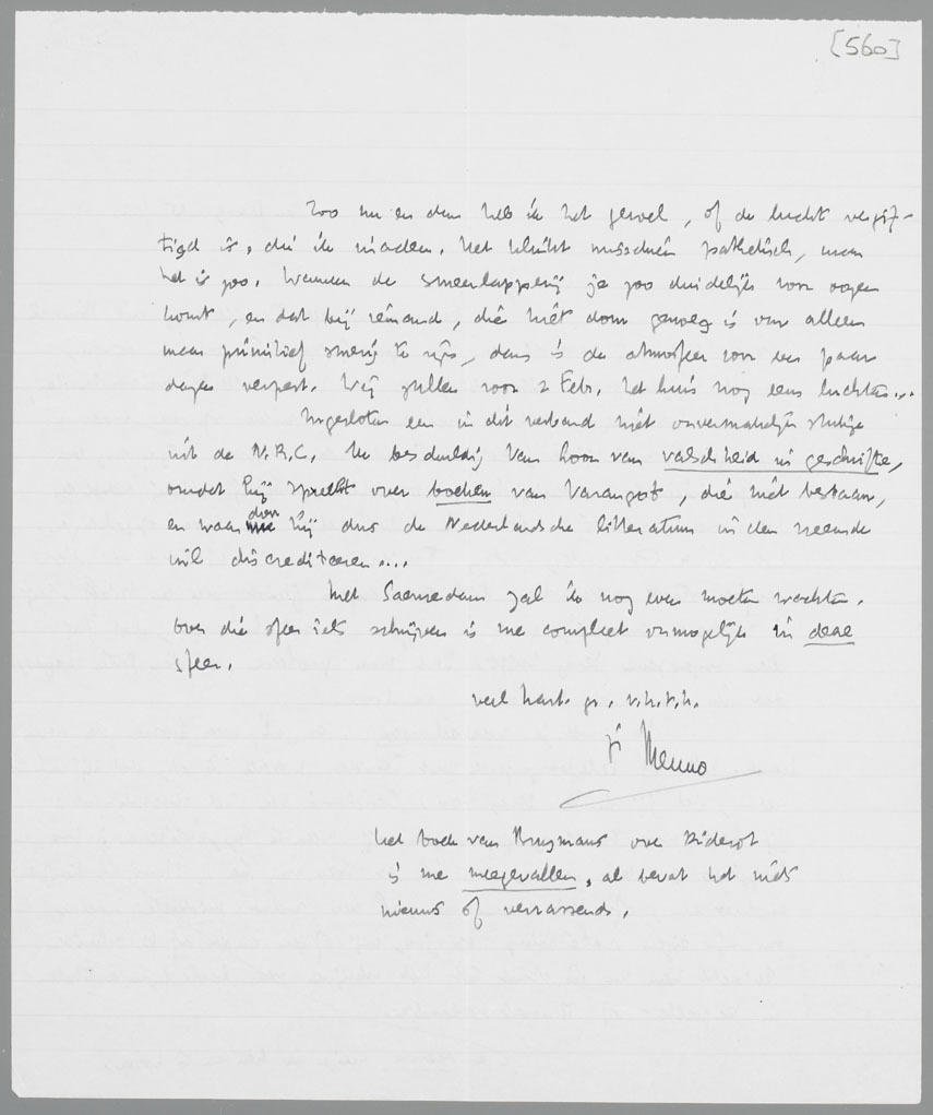 Vanmorgen heeft Truida mij uit Brussel opgebeld en mij verzocht om zoo spoedig mogelijk over te komen, omdat zij ‘de zaak’ wilden bespreken; er waren allerlei misverstanden etc. Ik heb gezegd, dat ik wel met haar wilde spreken, maar in geen geval met Victor; hetgeen zij weigerde. Daarop volgde nog een beetje discussie, waarbij ik een oogenblik geweldig nijdig werd en het woord ‘ploertig’ liet vallen. Wij hebben toen maar opgehangen. Het dient tot niets, zoolang Truida onder den invloed van dit sujet staat. Van hem ligt er overigens juist weer een brief! Hij is verdomd energiek, moet ik zeggen, want hij weet, dat hij hem ongeopend terug krijgt. Toch maar probeeren, en dan later zeggen, dat ik hem niet heb willen aanhooren.