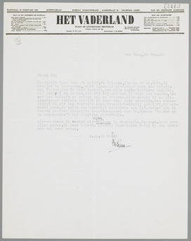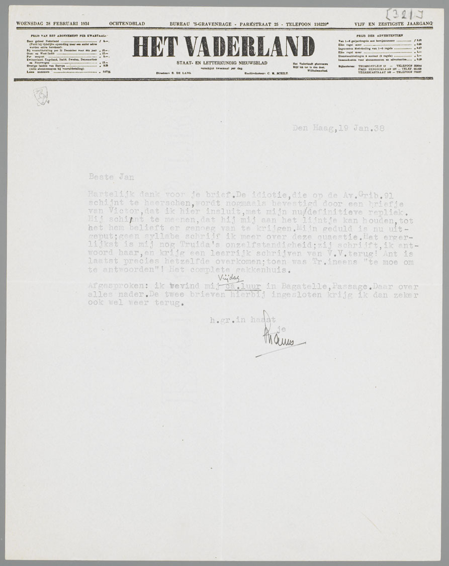 Hartelijk dank voor je brief. De idiotie, die op de Av.Grib. 91 schijnt te heerschen, wordt nogmaals bevestigd door een briefje van Victor, dat ik hier insluit, met mijn nu definitieve repliek. Hij schijnt te meenen, dat hij mij aan het lijntje kan houden, tot het hem belieft er genoeg van te krijgen. Mijn geduld is nu uitgeput; geen syllabe schrijf ik meer over deze quaestie. Het ergerlijkst is mij nog Truida's onzelfstandigheid; zij schrijft, ik antwoord haar, en krijg een leerrijk schrijven van V.V. terug! Ant is laatst precies hetzelfde overkomen; toen was Tr. ineens ‘te moe om te antwoorden’! Het complete gekkenhuis.