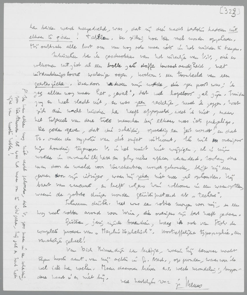 Dank voor je brief; ik ben het volmaakt met je eens, wat de zaak Varangot betreft. Het eenige verschil tusschen onze positie is alleen de familierelatie. Maar er is nog het een en ander gebeurd, dat ik je nog moet meedeelen. Na het telefoongesprek met Truida, waarover ik je schreef, en dat op niets uitliep, ontving ik 's avonds plotseling een telegram, waarin stond, dat zij met zijn beiden op weg waren naar Den Haag! Terwijl ik door de telefoon uitdrukkelijk geweigerd had V. te ontvangen!! Ik moest uit voor de krant, en behoefde dus niet eens de deur te barricadeeren. Wim heeft de hooge gasten toen van de trein gehaald en naar zijn huis gebracht, waar hij hen ontzettend genegerd moet hebben, want hij was er den volgenden dag nog razend van. Het heele gesprek was, wat V. betreft, hopeloos; deze deed driemaal een poging om theatraal te verdwijnen, maar ging dan weer zitten. Wim heeft hun aan eenige concrete voorbeelden gedemonstreerd, dat zij op weg waren paranoia-lijders te worden, hetgeen op Truida zichtbaar indruk maakte. Maar V. was volgens Wim volmaakt crazy. Het paar heeft toen bij de hospita van Wim gelogeerd.