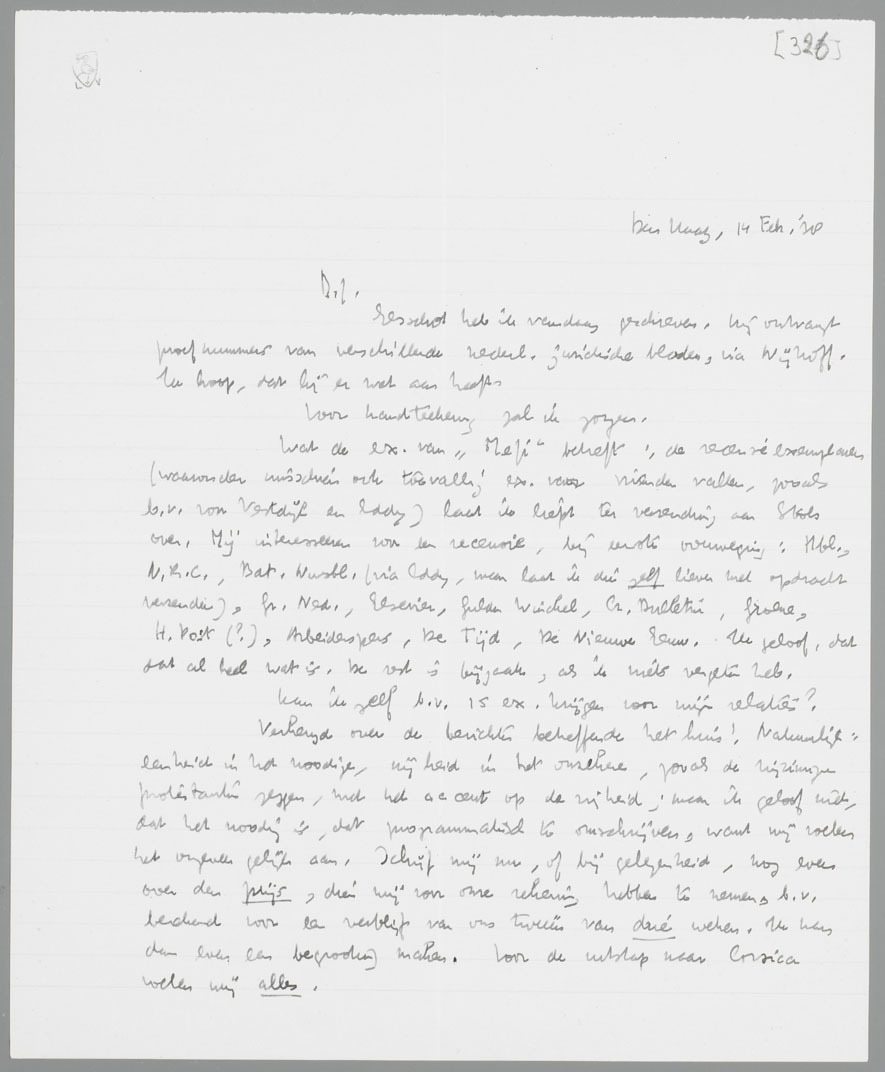 Wat de ex. van ‘Mefi’ betreft: de recensieexemplaren (waaronder misschien ook toevallig ex. voor vrienden vallen, zooals b.v. voor Vestdijk en Eddy) laat ik liefst ter verzending aan Stols over. Mij interesseeren voor een recensie, bij eerste overweging: Hbl., N.R.C., Bat. Nwsbl. (via Eddy, maar laat ik die zelf liever met opdracht verzenden), Gr. Ned., Elsevier, Gulden Winckel, Cr. Bulletin, Groene, H. Post (?), Arbeiderspers, De Tijd, De Nieuwe Eeuw. Ik geloof, dat dat al heel wat is. De rest is bijzaak, als ik niet vergeten heb.