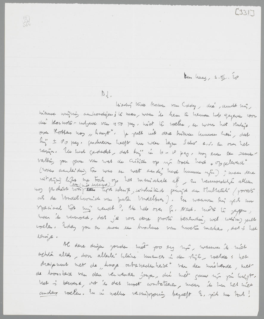 Hierbij twee brieven van Eddy, die, dunkt mij, nieuwe wrijving aankondigen; te meer, waar ik hem te kennen heb gegeven voor die blocnote-uitgave van 450 pag. niet te voelen, en waar het stukje over Robbers nog ‘hangt’. Je zult uit deze brieven kunnen zien, dat hij ± 80 pag. geschreven heeft nu weer tegen Saks c.s. en over het ravijn. Ik had gedacht, dat hij in 6 - 8 pag. nog even een samenvatting zou geven van wat de critiek op zijn boek had ‘opgeleverd’ (waar aanleiding toe was en wat aardig had kunnen zijn); maar deze uitdijing lijkt me toch op het maniakale af, en vermoedelijk alleen nog geschikt voor een (niet bestaand) tijdschrift, uitsluitend gewijd aan Multatuli (zooiets als de Vondelkroniek van pater Vondelboer). En waarom hij zich nu speciaal tot mij wendt? Ik heb over Gr. Ned. niets te zeggen, maar ik vermoed, dat je voor deze groote bezending wel weinig zult voelen. Eddy zou er maar een brochure van moeten maken, dat lijkt me het eenige.