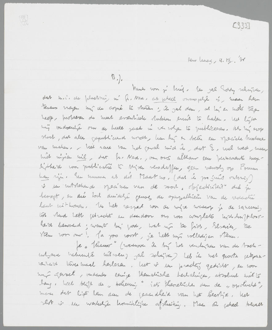 Dank voor je brief. Ik zal Eddy schrijven, dat m.i. de plaatsing in Gr. Ned. als geheel onmogelijk is, maar hem tevens vragen mij de copie te sturen; Ik zal dan, als hij er niets tegen heeft, probeeren de meest essentiele stukken eruit te halen. Het lijkt mij ondoenlijk om de heele zaak in vervolgen te publiceeren. Als hij erop staat, dat alles gepubliceerd wordt, kan hij er beter een speciale brochure van maken. Het rare van het geval vind ik, dat E. wel weet, maar niet inzien wil, dat Gr. Ned., om ons althans een permanente mogelijkheid van publicatie te blijven verschaffen, geen vervolg op Forum kan zijn. Een nummer als dit Maart no. (dat ik zojuist ontving) is een uitstekende specimen van de soort, objectiviteit die je beoogt, en die toch duidelijk genoeg de sympathieën van de redactie laat uitkomen. Ik heb respect voor de wijze waarop je de saneering tot stand hebt gebracht en daardoor ons voor complete tijdschriftloosheid bewaard; want bij god, wat zijn De Gids, Elsevier, De Stem voor ons! Ga zoo voort, je hebt mijn volledigen steun.