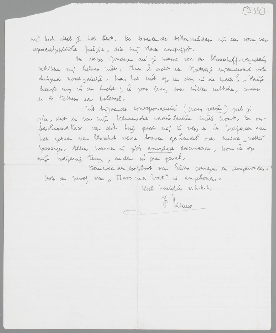Uit bijgaande correspondentie (graag retour) zul je zien, dat er van mijn Vlaamsche radio lectum niets komt. De onbeschaamdheid van dit tuig gaat mij te ver, en ik prefereer dan het gebaar van Elsschot verre boven gehandel over minder ‘nette’ passages. Alleen waneer zij zich compleet excuseren, kom ik op mijn weigering terug, anders in geen geval.