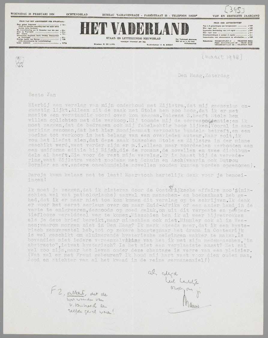 Baroja kwam helaas net te laat! Maar toch hartelijk dank voor je bemoeiingen! Ik moet je zeggen, dat ik gisteren door de Oostenrijksche affaire zoo'n (misschien wel wat pathologische) aanval van menschen- en boekenhaat heb gehad, dat ik er maar niet toe kon komen dit verslag op te schrijven. Ik denk er voor het eerst serieus over om naar Zuid-Afrika of een ander land in de verte te emigreeren, desnoods op goed geluk, om uit dit verpeste en perspectieflooze werelddeel weg te komen. Misschien ben ik al weer bijgetrokken als je deze brief bereikt, maar misschien ook niet. Himmler ook al in Weenen; waarom morgen niet in Den Haag? Ik merk steeds meer, dat ik een hysterisch zenuwgestel heb, tot op zekere hoogte; maar het drama in Oostenrijk is wel geschikt om sluimerende hysterische neigingen wakker te maken. Is bovendien niet iedere vereenzelviging van het ik met zijn medemenschen, ‘in abstracto’, ietwat hysterisch? Is het niet een verplaatste angst? Het zal wel zoo zijn, maar het leven onder deze chantage is verre van een pleizier. (Wat zal er met Freud gebeuren? Ik houd mijn hart vast voor dien ouden man, Jood en stichter van al het kwaad in de reine germanenziel).