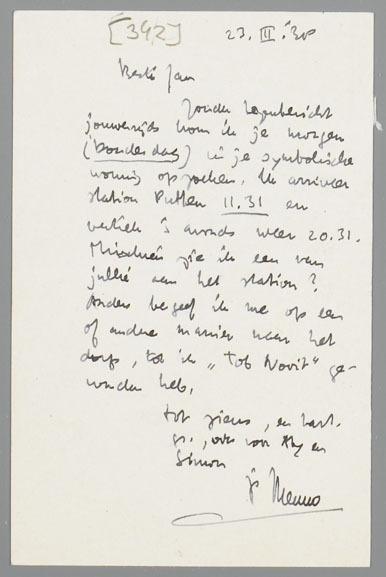 Zonder tegenbericht jouwerzijds kom ik je morgen (Donderdag) in je symbolische woning opzoeken. Ik arriveer station Putten 11.31 en vertrek 's avonds weer 20.31. Misschien zie ik een van jullie aan het station? Anders begeef ik me op een of andere manier naar het dorp, tot ik ‘Tob Nooit’ gevonden heb.