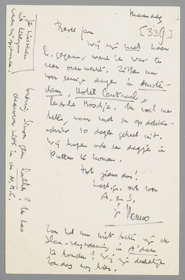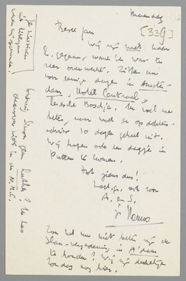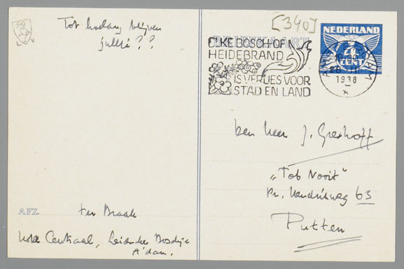 Wij zijn niet naar E. gegaan, want ik was te zeer overwerkt. Zitten nu voor eenige dagen in Amsterdam, Hotel Centraal, Leidsche Boschje. Ik voel me beter, maar moet er op doktersadvies 10 dagen geheel uit. Wij hopen ook een dagje in Putten te komen.