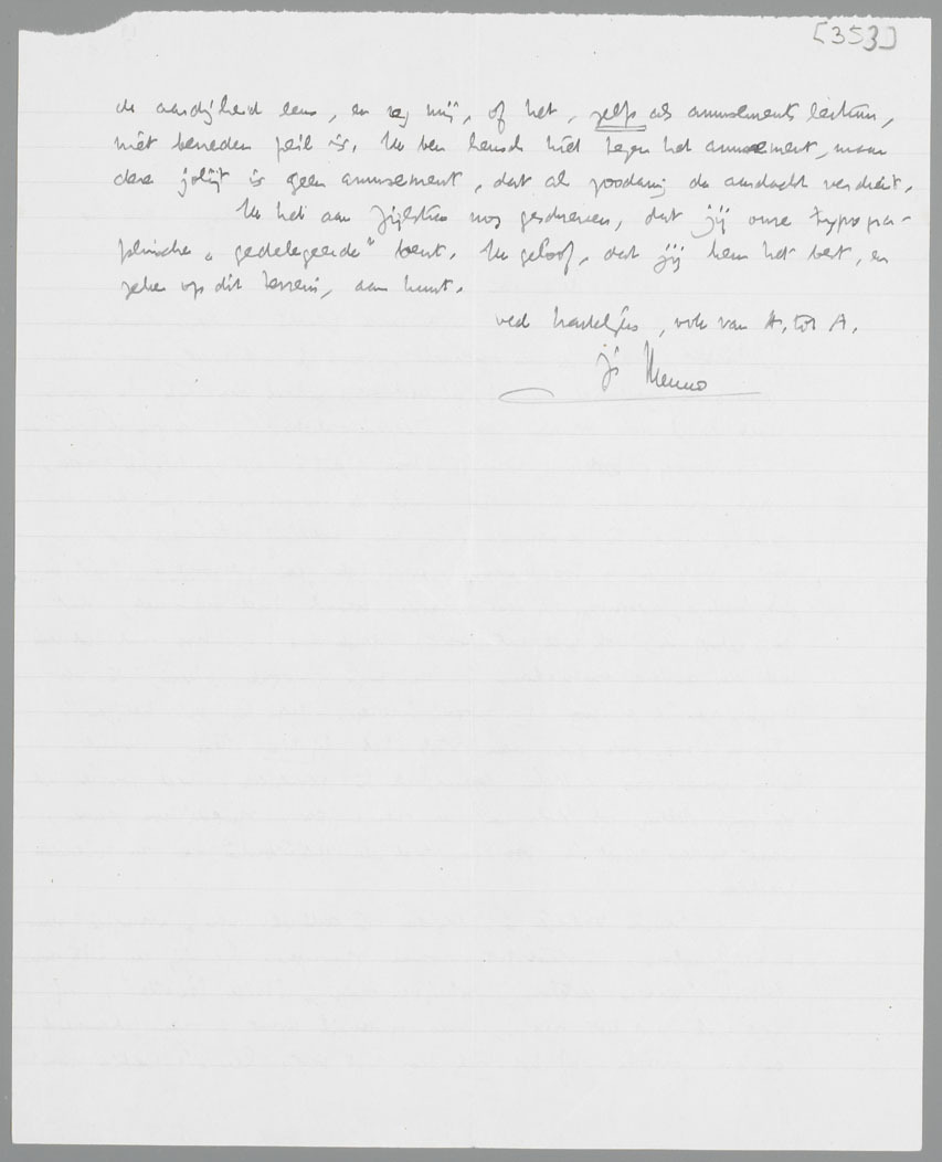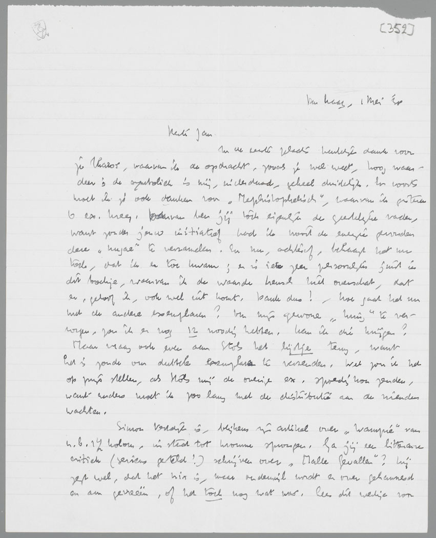 In de eerste plaats hartelijk dank voor je Ikaros, waarvan ik de opdracht, zoals je wel weet, hoog waardeer; de symboliek is mij, inderdaad, geheel duidelijk. En voorts moet ik je ook danken voor ‘Mephistophelisch’, waarvan ik gisteren 6 ex. kreeg. Daarvan ben jij toch eigenlijk de geestelijke vader, want zonder jouw initiatief had ik nooit de energie gevonden deze ‘nugae’ te verzamelen. En nu, achteraf, behaagt het nu toch, dat ik er toe kwam; er is iets zeer persoonlijks juist in dit boekje, waarvan ik de waarde heusch niet overschat, dat er, geloof ik, ook wel uit komt. Dank dus! - Hoe gaat het nu met de andere exemplaren? Om mijn gewone ‘kring’ te verzorgen, zou ik er nog 12 noodig hebben. Kan ik die krijgen? Maar vraag ook even aan Stols het lijstje terug, want het is zonde om dubbele exemplaren te verzenden. Wel zou ik het op prijs stellen, als Stols mij de overige ex. spoedig kon zenden, want anders moet ik zoo lang met de distributie aan de vrienden wachten.