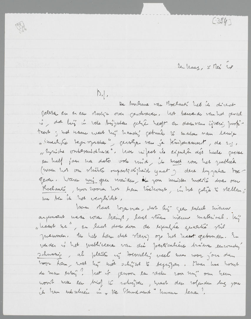 Daar staat tegenover, dat hij geen enkel nieuw argument naar voren brengt, laat staan nieuw materiaal. Hij ‘kaart na’, en laat daardoor de eigenlijke quaestie stil zwemmen. Ik heb hem dat stevig op het hart gebonden. En verder is het publiceeren van die particuliere brieven eenvoudig schunnig, al pleiten zij toevallig veel meer voor jou dan voor hem, wat hij niet schijnt te begrijpen. Maar hoe komt de man erbij? Het is gewoon een reden voor mij om hem nooit meer een brief te schrijven, want den volgenden dag zou ik hem misschien in ‘De Standaard’ kunnen lezen!