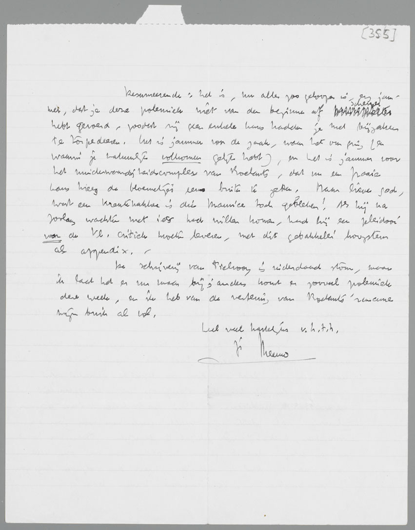 Resumeerende: het is, nu alles zoo geloopen is, erg jammer, dat je deze polemiek niet van den beginne af scherper hebt gevoerd, zoodat zij geen enkele kans hadden je met bijzaken te torpedeeren. Het is jammer voor de zaak, waar het om ging (en waarin je natuurlijk volkomen gelijk hebt), en het is jammer voor het minderwaardigheidscomplex van Roelants, dat nu een fraaie kans kreeg de bloemetjes eens buiten te zetten. Maar lieve god, wat een krentekakker is die Maurice toch gebleken! Als hij na zoolang wachten met iets had willen komen, had hij een pleidooi voor de Vl. critiek moeten leveren, met dit gebakkelei hoogstens als appendix. -