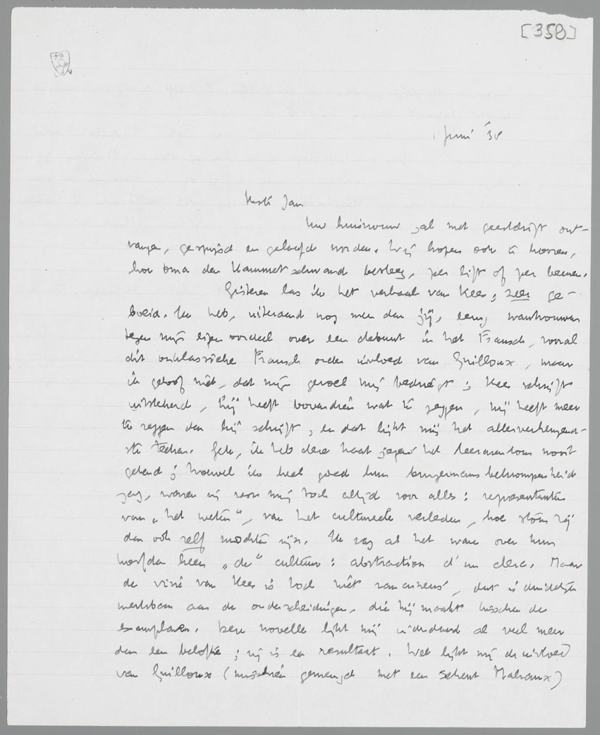 Gisteren las ik het verhaal van Kees, zeer geboeid. Ik heb, uiteraard nog meer dan jij, eenig wantrouwen tegen mijn eigen oordeel over een debuut in het Fransch, vooral dit onklassieke Fransch onder invloed van Guilloux, maar ik geloof niet, dat mijn gevoel mij bedriegt; Kees schrijft uitstekend, hij heeft bovendien wat te zeggen, hij heeft meer te zeggen dan hij schrijft, en dat lijkt mij het allerverheugendste teeken. Gek, ik heb deze haat jegens het leerarendom nooit gekend; hoewel ik heel goed hun burgermans bekrompenheid zag, waren zij voor mij toch altijd voor alles: representanten van ‘het weten’, van het cultureele verleden, hoe stom zij dan ook zelf mochten zijn. Ik zag als het ware over hun hoofden heen ‘de’ cultuur: abstraction d'un clerc. Maar de visie van Kees is toch niet rancuneus, dat is duidelijk merkbaar aan de onderscheidingen, die hij maakt tusschen de exemplaren. Deze novelle lijkt mij inderdaad al veel meer dan een belofte; zij is een resultaat. Wel lijkt mij de invloed van Guilloux (misschien gemengd met een scheut Malraux) bijzonder duidelijk, maar de ‘denkinhoud’ heeft niets epigonistisch en dat bepaalt voor mij tenslotte de waarde.