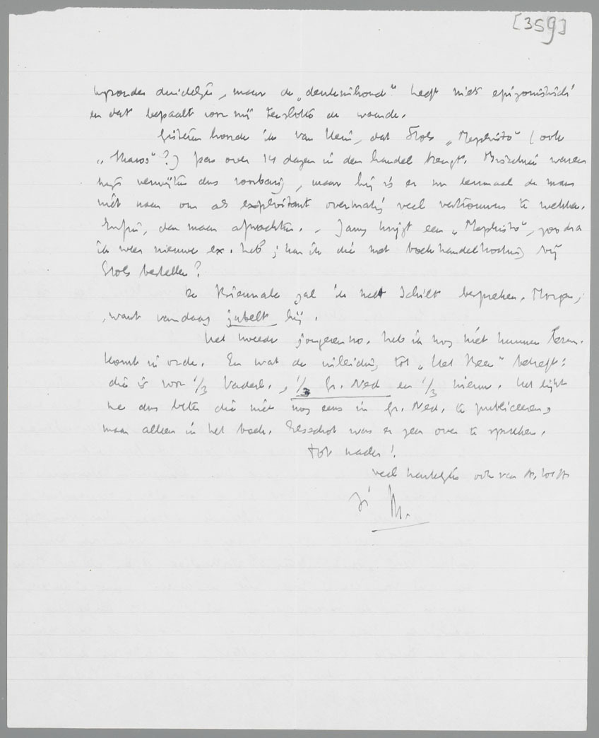 Gisteren hoorde ik van Hein, dat Stols ‘Mephisto’ (ook ‘Ikaros’?) pas over 14 dagen in den handel brengt. Misschien waren mijn verwijten dus voorbarig, maar hij is er nu eenmaal de man niet naar om als exploitant overmatig veel vertrouwen te wekken. Enfin, dan maar afwachten. Jany krijgt een ‘Mephisto’, zoodra ik weer nieuwe ex. heb; kan ik die met de boekhandelkorting bij Stols bestellen?