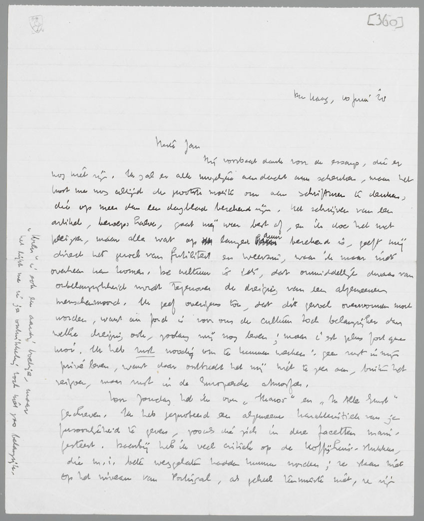 Voor Zondag heb ik over ‘Ikaros’ en ‘In Alle Ernst’ geschreven. Ik heb geprobeerd een algemeene karakteristiek van je persoonlijkheid te geven, zooals die zich in deze facetten manifesteert. Daarbij heb ik veel critiek op de koffijhuis-stukken, die m.i. beter weggelaten hadden kunnen worden; ze staan niet op het niveau van Portugal, als geheel tenminste niet, ze zijn te journalistiek. Van ‘Ikaros’ daarentegen word ik steeds meer verrukt, naarmate ik het vaker herlees. Over deze tegenstelling was een en ander te zeggen. Ik hoop, dat ik dat ook zoo scherp mogelijk gedaan heb; dat ik de koffijhuis-stukken toch wel aardig vind, heb ik opzettelijk niet laten uitkomen, want ze behooren absoluut niet tot je beste werk. (Overigens: noch ‘Ikaros’, noch ‘Mephi’ zijn ergens te koop, nog steeds niet! Wil deze Stols geld verliezen?).