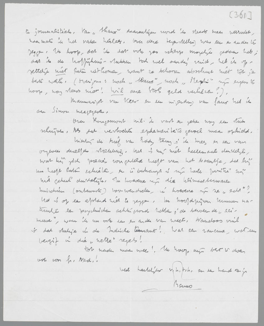 Hierbij de brief van Eddy terug; ik kreeg er een van ongeveer dezelfde strekking. Het is mij niet heelemaal duidelijk, wat hij zich precies voorgesteld heeft van het baantje, dat hij nu heeft laten schieten, en überhaupt is zijn heele positie mij niet geheel duidelijk. In hoeverre zijn die klimaatbezwaren misschien (onbewuste) voorwendselen, in hoeverre zijn ze ‘echt’? Het is op een afstand niet te zeggen. De hoofdpijnen kunnen natuurlijk een psychischen achtergrond hebben; de beroemde ‘seinuwe’, waar ik nu ook een en ander van weet. Nameloos vuil is dat stukje in de Indische Courant! Wat een rancune, wat een vergif in die ‘nette’ regels!