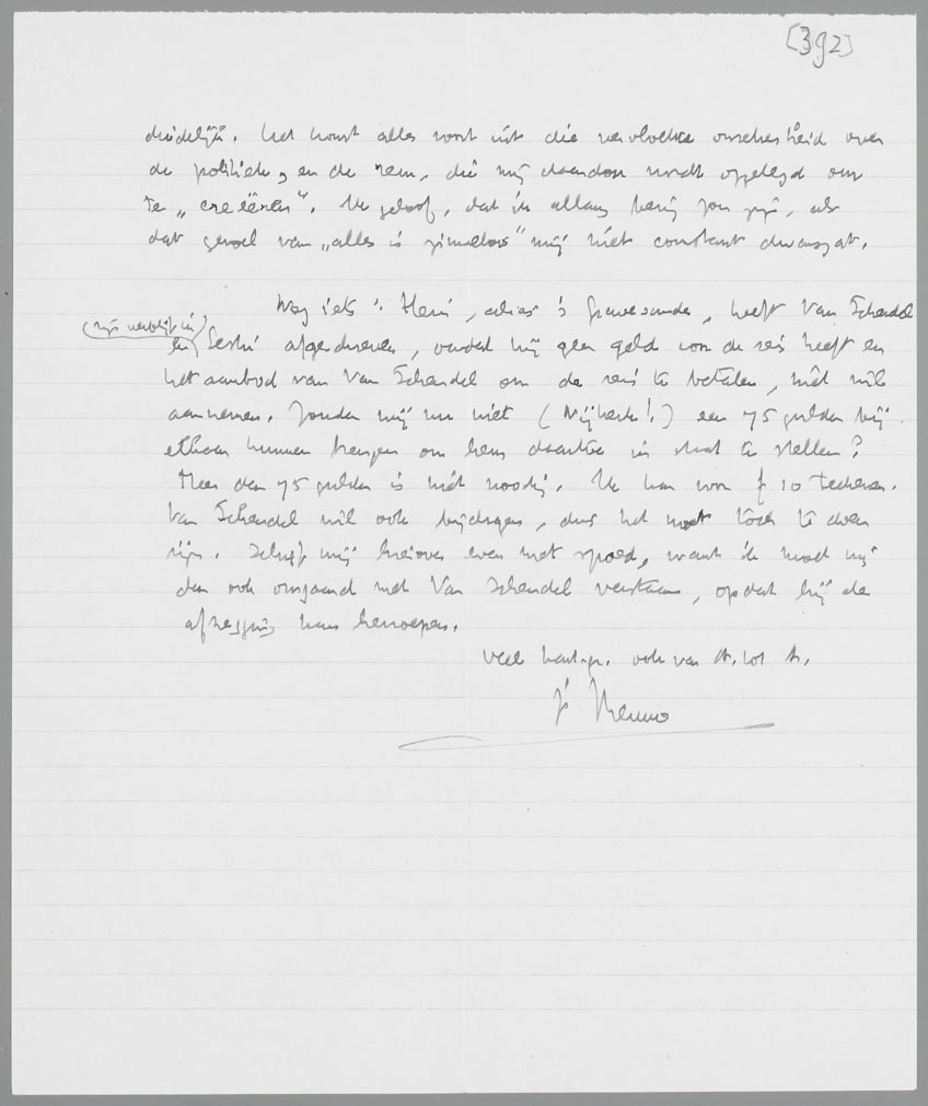 Nog iets: Hein, alias 's Gravesande, heeft Van Schendel en zijn verblijf in Sestri afgeschreven, omdat hij geen geld voor de reis heeft en het aanbod van Van Schendel om de reis te betalen, niet wil aannemen. Zouden wij nu niet (Nijkerk!) een 75 gulden bij elkaar kunnen brengen om hem daartoe in staat te stellen? Meer dan 75 gulden is niet noodig. Ik kan voor ƒ10 teekenen. Van Schendel wil ook bijdragen, dus het moet toch te doen zijn. Schrijf mij hierover even met spoed, want ik moet mij dan ook omgaand met Van Schendel verstaan, opdat hij de afzegging kan herroepen.
