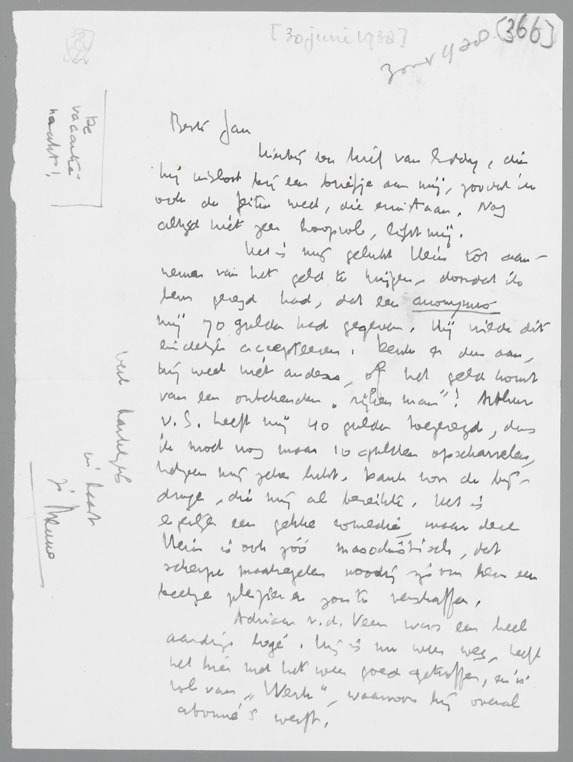 Het is mij gelukt Hein tot aannemen van het geld te krijgen, doordat ik hem gezegd had, dat een anonymus mij 70 gulden had gegeven. Hij wilde dit eindelijk accepteeren. Denk er dus aan, hij weet niet anders, of het geld komt van een onbekenden ‘rijken man’! Arthur v.S. heeft mij 40 gulden toegezegd, dus ik moet nog maar 10 gulden opscharrelen, hetgeen mij zeker lukt. Dank voor de bijdrage, die mij al bereikte. Het is eigenlijk een gekke comedie, maar deze Hein is ook zóó masochistisch, dat scherpe maatregelen noodig zijn om hem een beetje pleizier en zon te verschaffen.