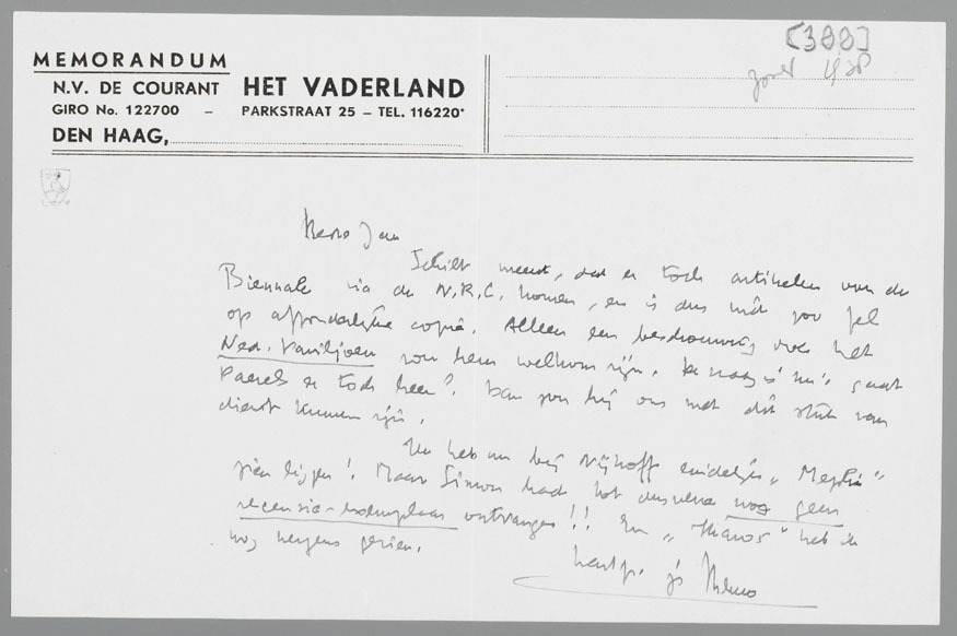 Schilt meent, dat er toch artikelen van de Biennale via de N.R.C. komen, en is dus niet zoo fel op afzonderlijke copie. Alleen een beschouwing over het Ned. Paviljoen zou hem welkom zijn. De vraag is nu: gaat Paerels er toch heen? Dan zou hij ons met dit stuk van dienst kunnen zijn. Ik heb nu bij Nijhoff eindelijk ‘Mephi’ zien liggen! Maar Simon had tot dusverre nog geen recensie-exemplaar ontvangen!! En ‘Ikaros’ heb ik nog nergens gezien.
