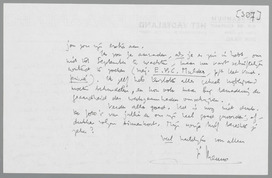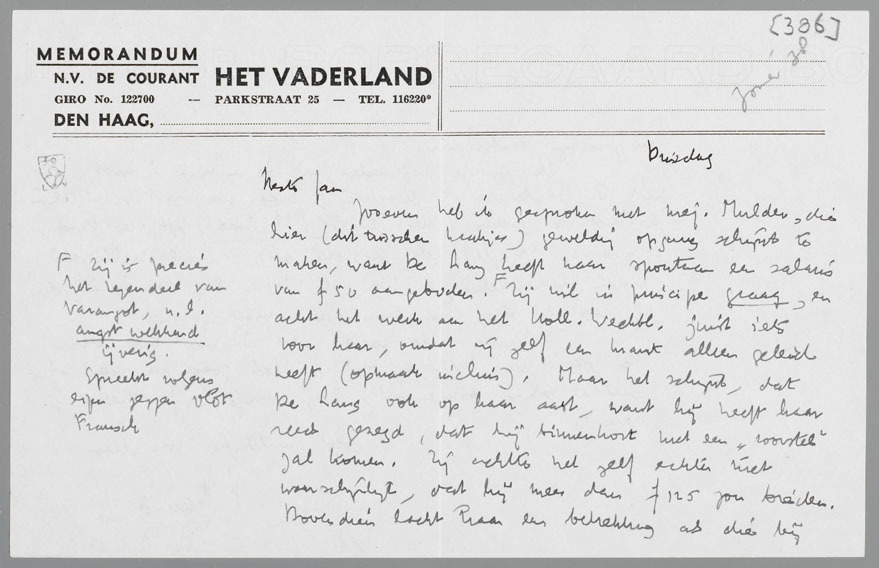 Zooeven heb ik gesproken met mej. Mulder, die hier (dit tusschen haakjes) geweldig opgaves schijnt te maken, want De Lang heeft haar spontaan een salaris van ƒ50 aangeboden. Zij is precies het tegendeel van Varangot, n.l. angstwekkend ijverig. Spreekt volgens eigen zeggen vlot Fransch. Zij wil in principe graag, en acht het werk aan het Holl. Weekbl. juist iets voor haar, omdat zij zelf een krant alleen geleid heeft (opmaak incluis). Maar het schijnt, dat De Lang ook op haar aast, want hij heeft haar reeds gezegd, dat hij binnenkort met een ‘voorstel’ zal komen. Zij achtte het zelf echter niet waarschijnlijk, dat hij meer dan ƒ125 zou bieden. Bovendien lacht haar een betrekking als die bij jou zou zijn extra aan. Ik zou je aanraden, als je er zin in hebt, om niet tot September te wachten, maar nu vast schriftelijk contact te zoeken (mej. E.P.C. Mulder, p/a Het Vad., privé). Ik zelf heb tenslotte alles geheel vrijblijvend moeten behandelen, en kon ook maar bij benadering de geaardheid der werkzaamheden omschrijven. Verder alles goed. Het is nog niet druk. De foto's van jullie en ons zijn heel goed geworden; afdrukken volgen binnenkort. Mijn vorige brief bereikte je zeker?
