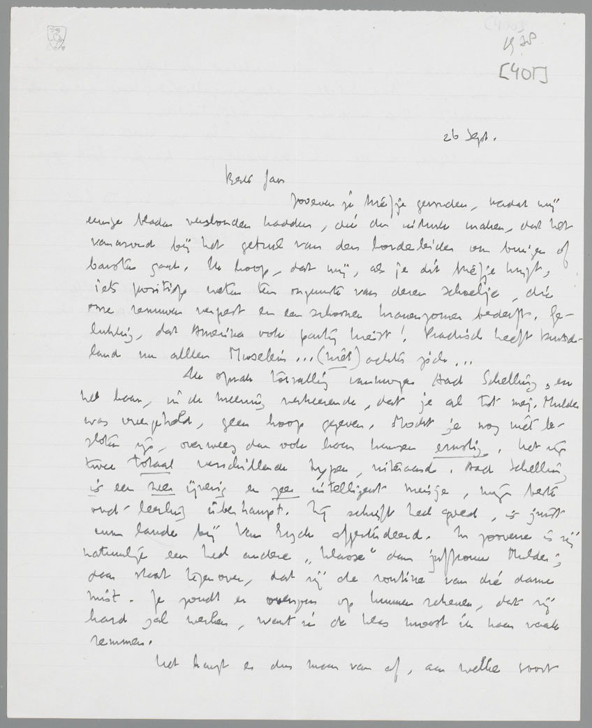 Ik sprak toevallig vanmorgen Aad Schelling, en heb haar, in de meening verkeerende, dat je al tot mej. Mulder was overgehold, geen hoop gegeven. Mocht je nog niet besloten zijn, overweeg dan ook haar kansen ernstig. Het zijn twee totaal verschillende typen, uiteraard. Aad Schelling is een zeer ijverig en zeer intelligent meisje, mijn beste oud-leerling überhaupt. Zij schrijft heel goed, is juist cum laude bij Van Eijck afgestudeerd. In zooverre is zij natuurlijk een heel andere ‘klasse’ dan juffrouw Mulder; daar staat tegenover, dat zij de routine van die dame mist. Je zoudt er overigens op kunnen rekenen, dat zij hard zal werken, want in de klas moest ik haar vaak remmen.