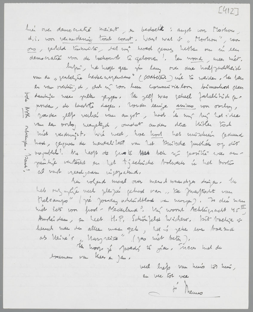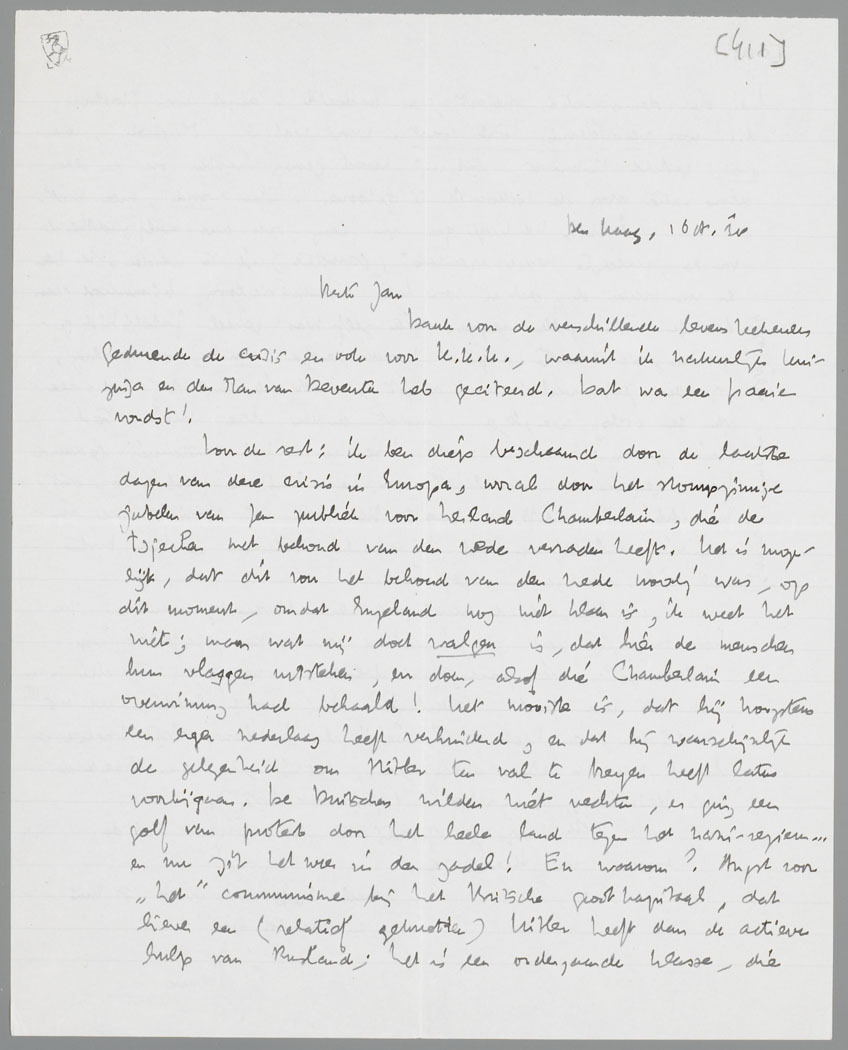 Voor de rest: ik ben diep beschaamd door de laatste dagen van deze crisis in Europa, vooral door het stompzinnige jubelen van Jan publiek voor heiland Chamberlain, die de Tsjechen met behoud van den vrede verraden heeft. Het is mogelijk, dat dit voor het behoud van den vrede noodig was, op dit moment, omdat Engeland nog niet klaar is, ik weet het niet; maar wat mij doet walgen is, dat hier de menschen hun vlaggen uitsteken, en doen, alsof die Chamberlain een overwinning had behaald! Het mooiste is, dat hij hoogstens een erger nederlaag heeft verhinderd, en dat hij waarschijnlijk de gelegenheid om Hitler ten val te brengen heeft laten voorbijgaan. De Duitschers wilden niet vechten, er ging een golf van protest door het heele land tegen het nazi-regiem... en nu zit het weer in den zadel! En waarom? Angst voor ‘het’ communisme bij het Britsche grootkapitaal, dat liever een (relatief geknotten) Hitler heeft dan de actieve hulp van Rusland; het is een ondergaande klasse, die hier over democratie meiert, en bedoelt: angst voor Moskou, d.i. voor verandering tout court. Want wat is ‘Moskou’, voor ons, gesteld tenminste, dat wij moed genoeg hebben om in een democratie voor de toekomst te gelooven! Een woord, meer niet.