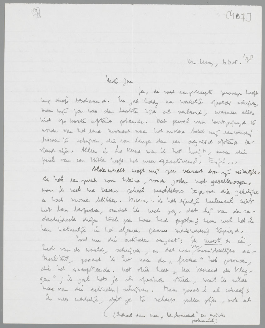 Wat nu die artikelen aangaat: ik moest er één, heet van de naald, schrijven, en dat was van onmiddellijke actualiteit, zoodat ik het naar de ‘Groene’ heb gezonden, die het accepteerde. Het stuk heet ‘Het Verraad der Vlaggen’; ik zal het je als specimen sturen, want ik wilde meer van die artikelen <hoewel dan meer ‘beschouwend’ en minder polemisch> schrijven. Maar zooals ik al schreef: ik vrees werkelijk, dat ze te scherp zullen zijn, ook al kan ik er eenige formeele diplomatie in betrachten. Zonder die scherpte is voor mij de aardigheid eraf. De ‘Groene’ is uiteraard tamelijk geschikt voor zulk werk, omdat het blad een principieel- antifascistische politiek volgt, maar ik voel toch niet zoo bijzonder veel voor dat milieu.