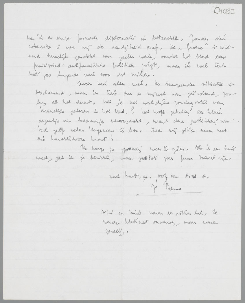 Verder hier alles wel. De Europeesche situatie is beschamend, maar ik heb me er vrijwel van geïsoleerd, zoolang als het duurt. Heb je het walgelijke Zondagstuk van Krekeltje gelezen in Het Vad.? Het heeft gelukkig een klein regentje van bedankjes veroorzaakt, want deze gatlikkerij was toch zelfs velen Hagenaars te bar. Maar wij zitten maar met die karakterlooze krant!