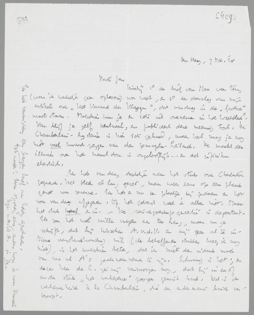 Hierbij 1o de brief van Mea weer terug (waar ik werkelijk geen oplossing voor weet), en 2o den doorslag van mijn artikel over ‘Het Verraad der Vlaggen’, dat vandaag in de ‘Groene’ moet staan. Misschien kun je er iets uit overnemen in het Weekblad? Dan blijf je zelf neutraal, en publiceert deze meening toch. De Chamberlain-hysterie is hier iets geluwd, maar toch mag je nog niet veel kwaad zeggen van den paraplu-heiland. De macht der illusies over het menschdom is ongelooflijk... en act infinitum elastisch.
